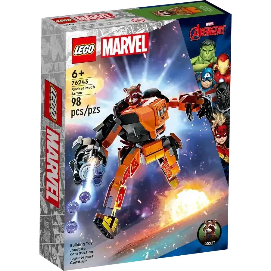 Marvel Studios’ Guardians of the Galaxy fans aged 6 and up are sure to love LEGO® Marvel Rocket Mech Armor (76243). The supersized figure puts Marvel’s raging raccoon in the cockpit of his own mighty battling machine.