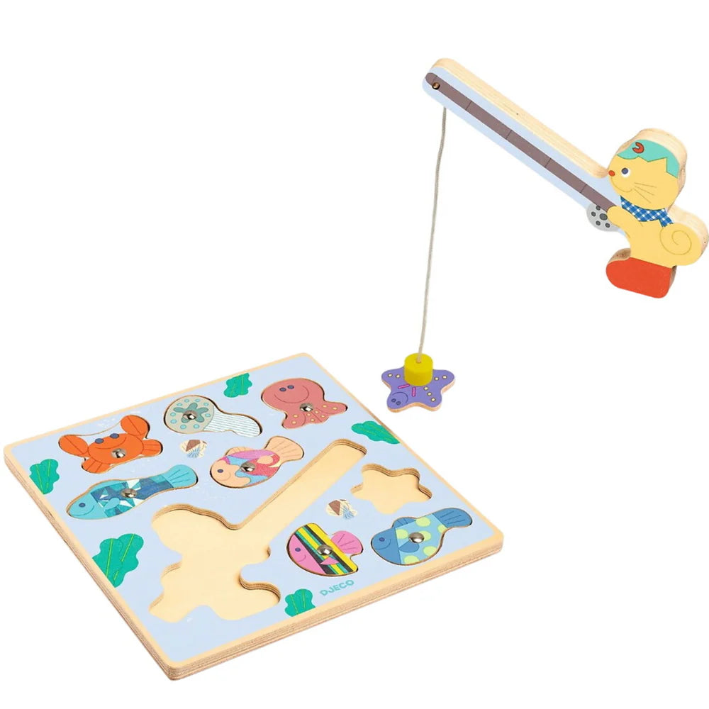 Discover the RELIEF PUZZLES collection with the Puzz & Fish Bariolo by Djeco. Puzz & Fish is a 2-in-1 game that combines a wooden puzzle with a fishing game. The fishing rod, held by a cat, is magnetized, allowing the child to catch the fish. Once the fish are caught, the child places them back on the base. This game provides an interactive experience where the child can fish for the fish and then replace them in their spots, making it both fun and educational. The fishing piece is large, making it easy for small hands to grasp. The fish are thin and don’t stick out from the base, which makes the activity even more engaging. The game comes in a convenient box, perfect for gifting or storage.